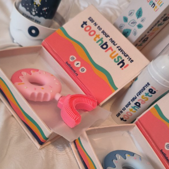 "Táto sada je geniálna! Silikón je špičkovej kvality a pena nádherne vonia. Neuveriteľné, ako je jednoduchšie dieťaťu vysvetliť čistenie zubov, keď je to také jednoduché a 'cool'. Náš zubár je veľmi spokojný s pokrokom!"