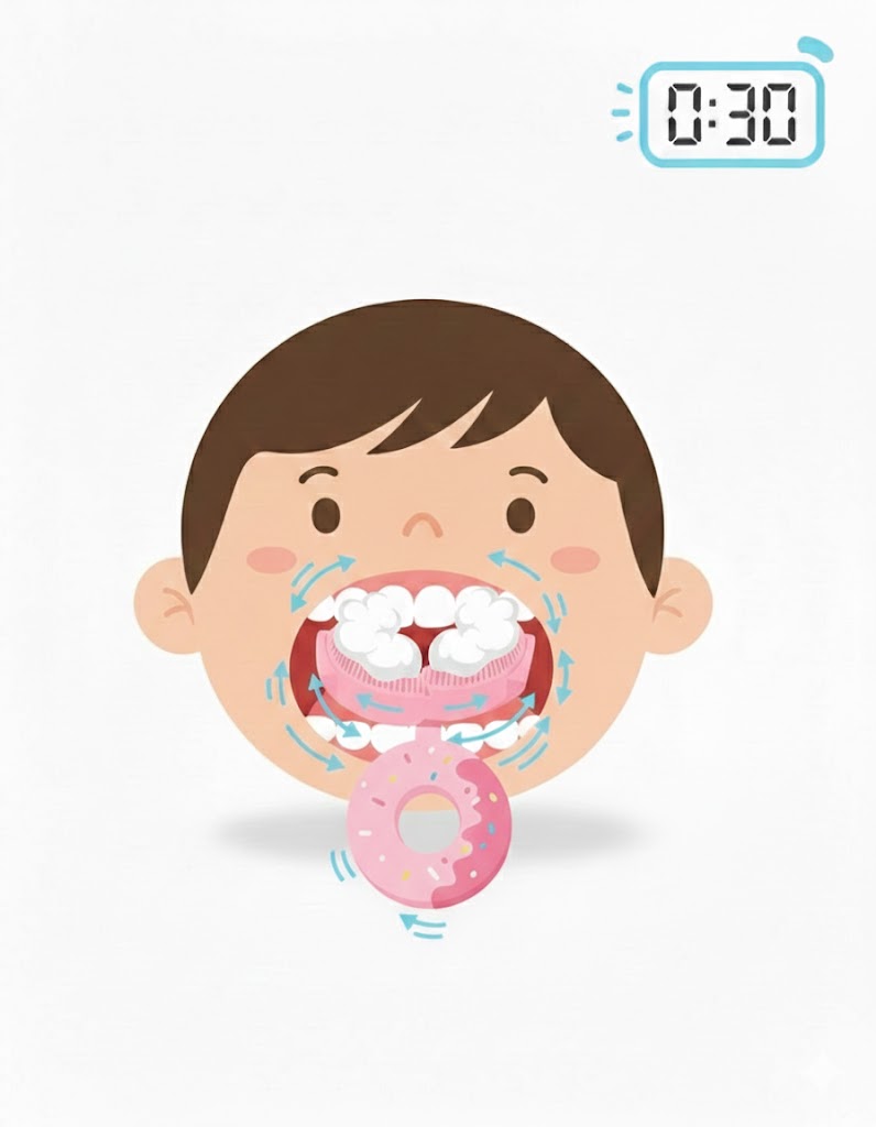 2. krok - Povzbudzujte dieťa, aby zahryzlo do kefky, potom stlačením tlačidla ju spustí. Jemnými, krúživými a bočnými pohybmi vyčistí každú plochu zuba za iba 30 sekúnd.